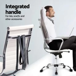 Bring a touch of contemporary living to your home or office interior with our Artiss office chair. Full of iconic styling, the office chair is absolutely sleek and elegant in every profile. More so with its faux leather upholstery that offers sophistication and class. Better still, the seat is rotatable 360 to face any direction with ease. It also comes with both height and tilt adjustment to allow you to be seated at your most comfortable position and posture. Thoughtful touches such as a chrome-finished rack at the back of the chair allows for hanging of ties, scarfs and other fashion accessories. Not least, the similar chrome adorned base has five wheel castors for easy movement.