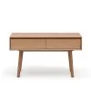 The table is expertly crafted from durable solid oak and highly functional. Thanks to its compact design, our console table takes up very little space and fits into smaller areas. Two drawers offer you additional space for your knick-knacks, cosmetics and other small belongings.