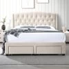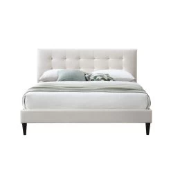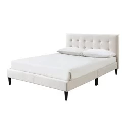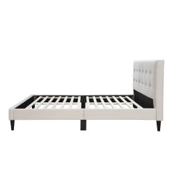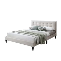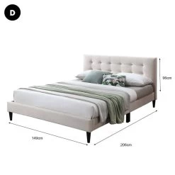 Enhance your bedroom and spruce your sleeping space with the DukeLiving Megan Tufted Upholstered Bed Frame Beige (Double, Queen). Upholstered in premium fabric, it features a tufted headboard for chic charm and appeal. Suitable for all mattress types, this frame is available in Double and Queen sizes. Its modern and minimalist design makes it a perfect addition to any bedroom!