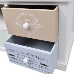 This antique-style side cabinet has 5 smoothly running drawers, which provide ample storage space for your personal belongings and will help keep your room tidy. The middle drawer is painted in an elegant light green colour. The 4 side drawers with vintage country-style prints add to the rural charm of the lowboard. The side drawers can be exchanged. Above the middle drawer, you will find a spacious compartment, where you can keep items such as multimedia appliances, books, magazines and other items you’d like to keep within reach.