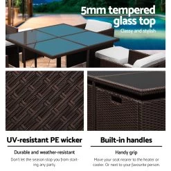 Time to give your backyard a complete make-over with our stylish yet affordable outdoor furniture set! It is made of powder coated steel frame and UV-resistant PE wicker, together with amazing designs, you won’t be disappointed with the quality. The set comes with a tempered glass top table along with seat cushions padded in 8cm high density foam that are removable and washable. With the water-resistant cover, you do not need to worry about storing them during rainy days anymore. Plus, it is easy to set up with the individual seatings around your backyard for a party!