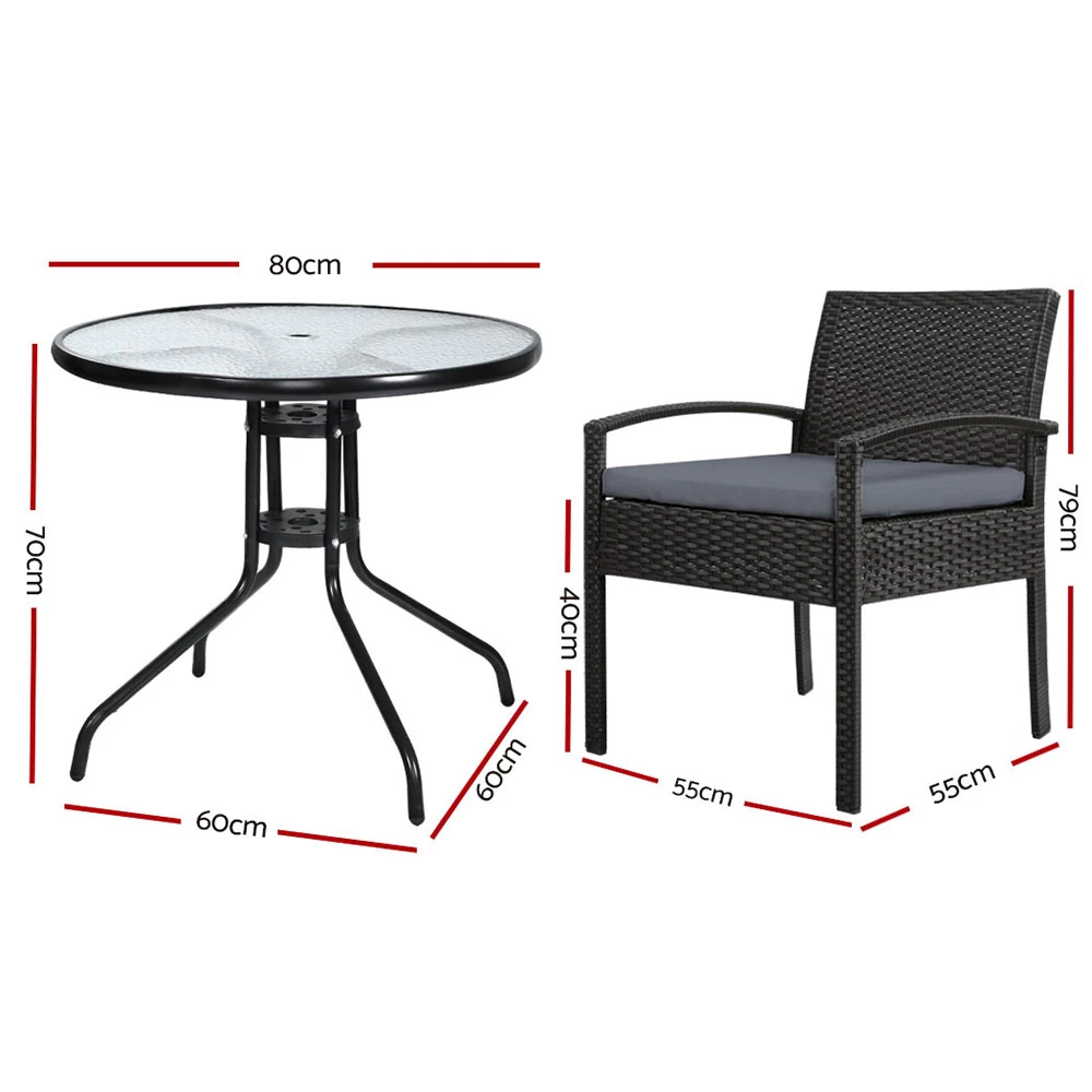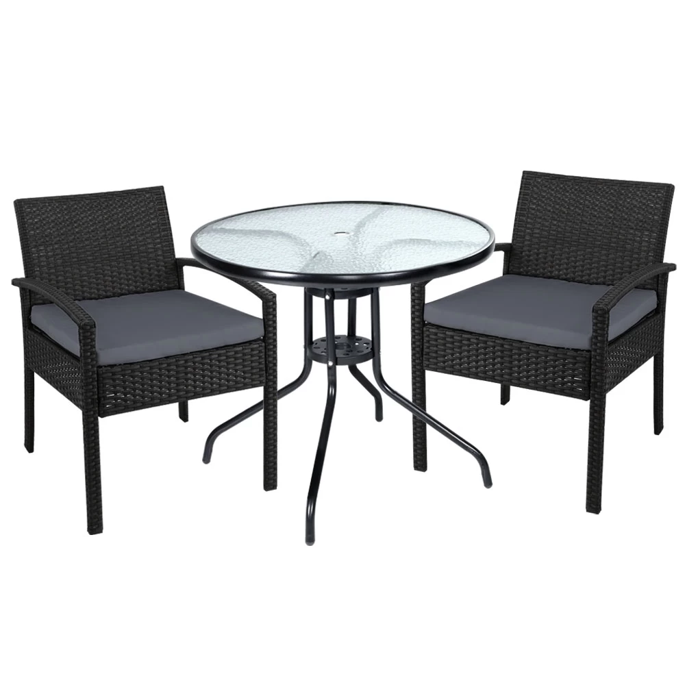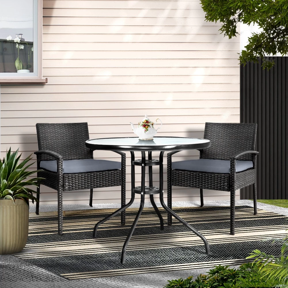 Enjoy the pleasant outdoors or have a nice chat with friends over a cuppa with our Gardeon Outdoor Bistro Set. With its chic and trendy profile, the set comes with a glass-top table and two wicker chairs. The elegant table is stunning in looks and equally as functional. The thick steel frame makes it durable and the 5mm thick tempered ripple glass does not only look stylish, it is easy to clean. Plus, there is a built-in hole for your parasol for you to relax outdoors for as long as you like during the hot summers without the fear of getting sunburnt. The chair is finished in meticulously weaved UV-resistant and weather-resistant PE wicker with a strong and sturdy steel frame construction. The exotic design, spacious seating and 5cm thick high-density foam cushions ensure comfort and style are always in place. Best of all, the removable and washable seat cushion cover makes cleaning up hassle-free. Together, the set is designed to please as well as stand up to the weather elements and the non-slip feet make the set suitable for use in even the most slippery of situations. With so much going for it, the bistro set certainly deserves its coveted space in your lovely backyard, deck or patio. Or even indoors for a unique presence.