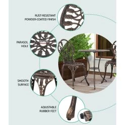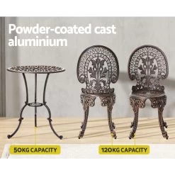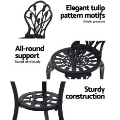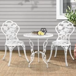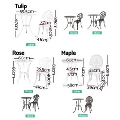 A truly classic design with lots of vintage appeal. Our Gardeon 3-piece Bistro Set is just perfect to wind back the era with an updated build. Made of cast aluminium with cast iron, the table and chairs set is designed to be rust-resistant with a powder-coated finish. The exquisite floral motifs really help to bring out the iconic character of this wondrous set. Better still, they are made to last with high weight capacities for both chairs and table. The set is suitable for use outdoors or indoors. Adjustable rubber feet are also affixed to its legs to prevent scratches to your pristine deck or floor. Not least, a parasol hole is provided in the table to add a parasol if needed. Available in tulip or rose motifs and three colours to suit your preference.