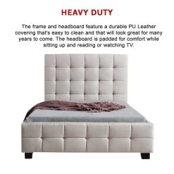 This bed from the expert craftspeople at Palermo measures 114 cm wide by 206 cm long, with a headboard that measures 88 cm tall (10cm leg & 78cm headboard) from top to bottom. It fits a king single mattress measuring 106 x 203 cm. The frame and headboard feature a durable Linen Fabric covering that’s easy to clean and that will look great for many years to come. The headboard is padded for comfort while sitting up and reading or watching TV. An attractive stitched-together look and clean, simple lines make this bed frame a perfect complement to the modern bedroom. And the beige colour adds visual appeal without being ostentatious.