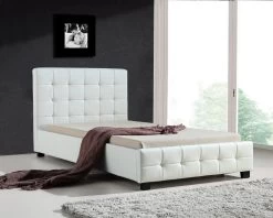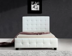 This bed from the expert craftspeople at Palermo measures 114 cm wide by 206 cm long, with a headboard that measures 88 cm tall (10cm leg & 78cm headboard) from top to bottom. It fits a king single mattress measuring 106 x 203 cm. The frame and headboard feature a durable PU Leather covering that’s easy to clean and that will look great for many years to come. The headboard is padded for comfort while sitting up and reading or watching TV. An attractive stitched-together look and clean, simple lines make this bed frame a perfect complement to the modern bedroom. And the white colour adds visual appeal without being ostentatious.