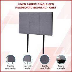 This headboard for standard Single-sized bed frames is created with quality materials, including easy-to-maintain Linen Fabric that will maintain its sophisticated look for many years to come. This particular model comes with elegant stitching accents that provide just the right level of understated pop. A neutral grey will blend seamlessly with a wide variety of bed frames and other bedroom furniture.
