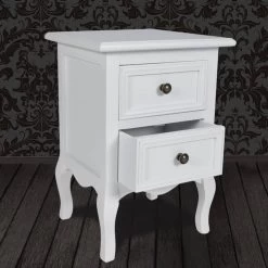 This white nightstand with two drawers will add a touch of style to your bedroom. The painted wood body is solid and perfect for storing and displaying your bedtime essentials, to help keep your room tidy.Since this furniture is hand-crafted, made of wood and painted white, it may come with small imperfections.
