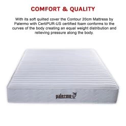 With its soft quilted cover the Contour 20cm Mattress by Palermo with CertiPUR-US certified foam conforms to the curves of the body creating an equal weight distribution and relieving pressure along the body. The independently encased coils eliminate motion disturbance to ensure an uninterrupted night’s sleep. A layer of foam quilted at the top and bottom of this mattress enhance its comfort and quality.