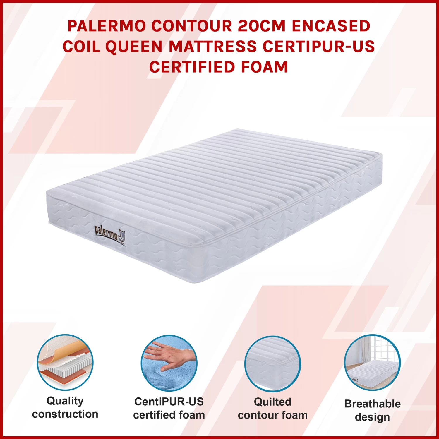 With its soft quilted cover the Contour 20cm Mattress by Palermo with CertiPUR-US certified foam conforms to the curves of the body creating an equal weight distribution and relieving pressure along the body. The independently encased coils eliminate motion disturbance to ensure an uninterrupted night’s sleep. A layer of foam quilted at the top and bottom of this mattress enhance its comfort and quality.