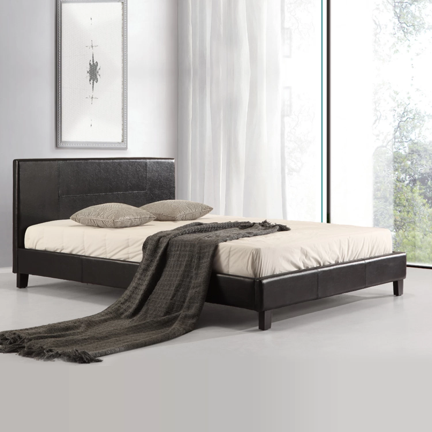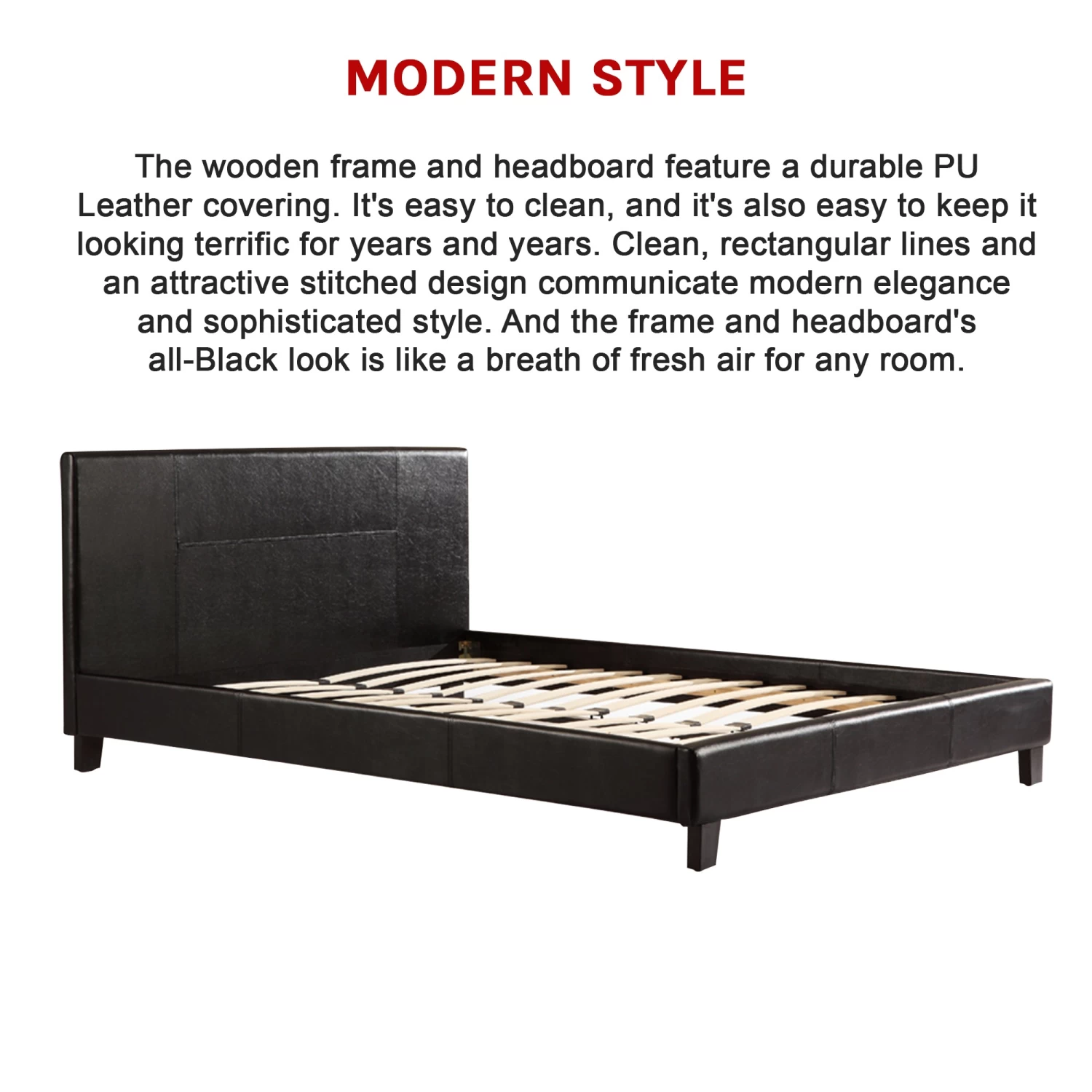 The wooden frame and headboard feature a durable PU Leather covering. It’s easy to clean, and it’s also easy to keep it looking terrific for years and years. Clean, rectangular lines and an attractive stitched design communicate modern elegance and sophisticated style. And the frame and headboard’s all-Black look is like a breath of fresh air for any room.