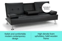 Measuring (w) 185cm x (d) 90cm x (h) 82cm, this sofa bed features timber frame as well as 2 cup holder spaces and comfort seating to provide a sofa that’s truly comfortable to sink back into and relax.